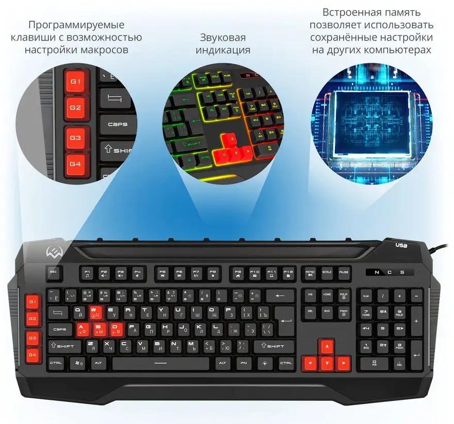 Цвет : черный; Модель : KB-G8800; Гарантийный срок : 12 месяцев; Интерфейс подключения : USB; Тип подключения клавиатуры : проводное; Длина кабеля : 180 см; Доп. опции клавиатуры : мультимедиа; подсветка; Подставка под телефон или планшет; Тип клавиатуры : мембранная; Высота клавиатуры : 19.5 мм; Ширина клавиатуры : 50 мм; Глубина клавиатуры : 3.5 мм; Количество клавиш клавиатуры : 109 шт.; Раскладка клавиатуры : английская/русская; Игровая модель : да; Предназначение клавиатуры : клавиатура для гейминга; персональный компьютер; ноутбук; Страна производства : Китай; Комплектация : Клавиатура — 1 шт.; Дополнительные сменные клавиши — 8 шт.; Ключ для съема клавиш — 1 шт.; Руководство пользователя — 1 шт.; Гарантийный талон — 1 шт.; Вес товара с упаковкой (г) : 1045 г; Длина упаковки : 23 см; Высота упаковки : 5 см; Ширина упаковки : 51 см; Раскладка клавиатуры : английская/русская; Модель : KB-G8800; Цвет : черный; Интерфейс подключения : USB; Доп. опции клавиатуры : мультимедиа; подсветка; Подставка под телеф
