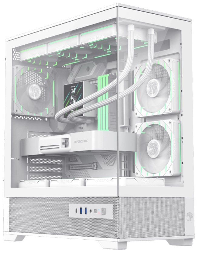 Современный корпус форм-фактора Middle Tower, сочетающий стильный белый дизайн с продуманной функциональностью для игровых и рабочих ПК. Светлое исполнение корпуса подчёркивает аккуратный внешний вид сборки и выгодно выделяет внутренние компоненты, особенно в сочетании с подсветкой, создавая эффектную визуальную композицию.