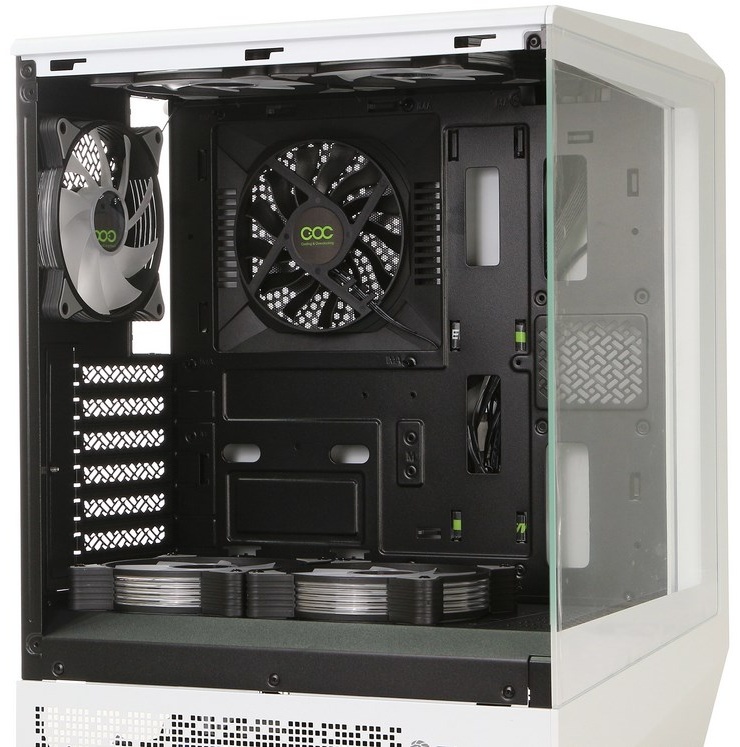 Корпус для игрового ПК Vista COC AB ATX Mid-Tower оснащен панорамным видом на 262°, запатентованным охлаждением COC, 5 вентиляторами ARGB и стильным корпусом с модульной компоновкой для гибкой сборки.