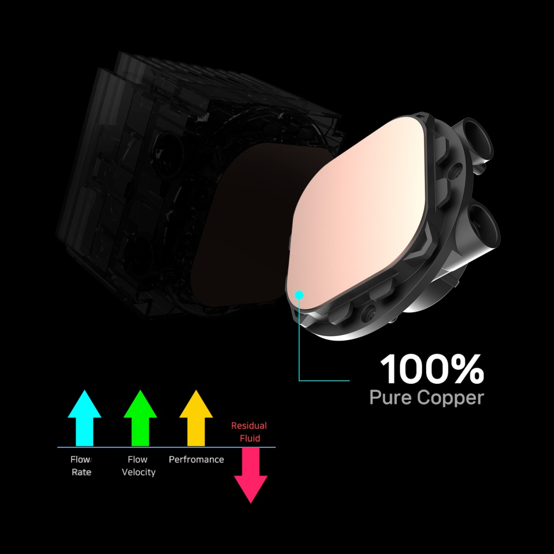Высокая эффективность: Система разработана для рассеивания тепла до 350 Вт (TDP), что делает ее подходящим выбором даже для мощных современных процессоров. Инновационная конструкция помпы с раздельными путями потоков хладагента помогает предотвратить перегрузку и повысить эффективность.
