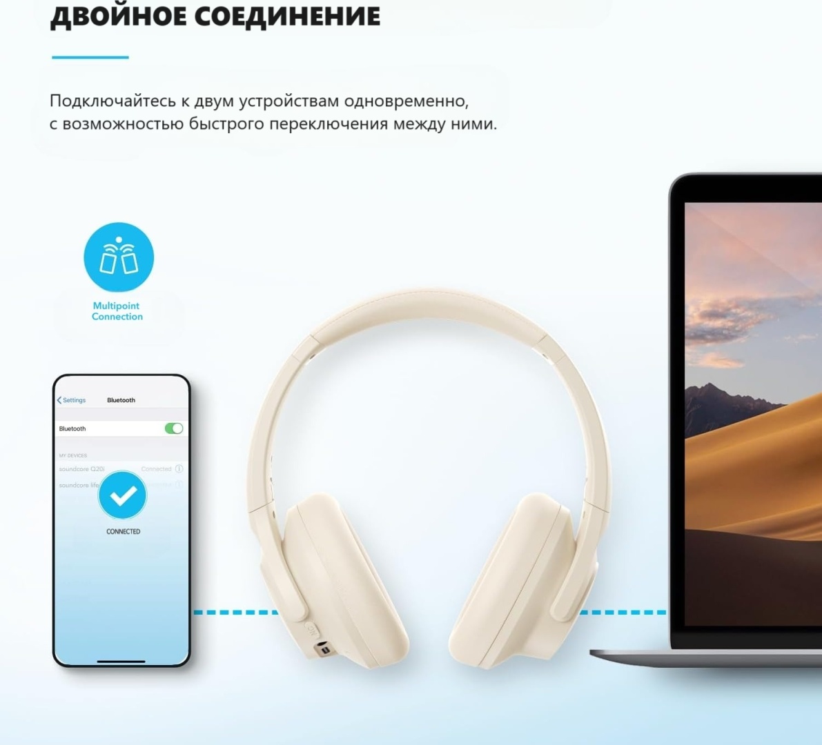Двойное соединение: подключайтесь к двум устройствам одновременно с помощью Bluetooth 5.0 и мгновенно переключайтесь между ними. Независимо от того, работаете ли вы на своем ноутбуке или вам нужно ответить на телефонный звонок, звук будет автоматически воспроизводиться с устройства, с которого вы хотите услышать.