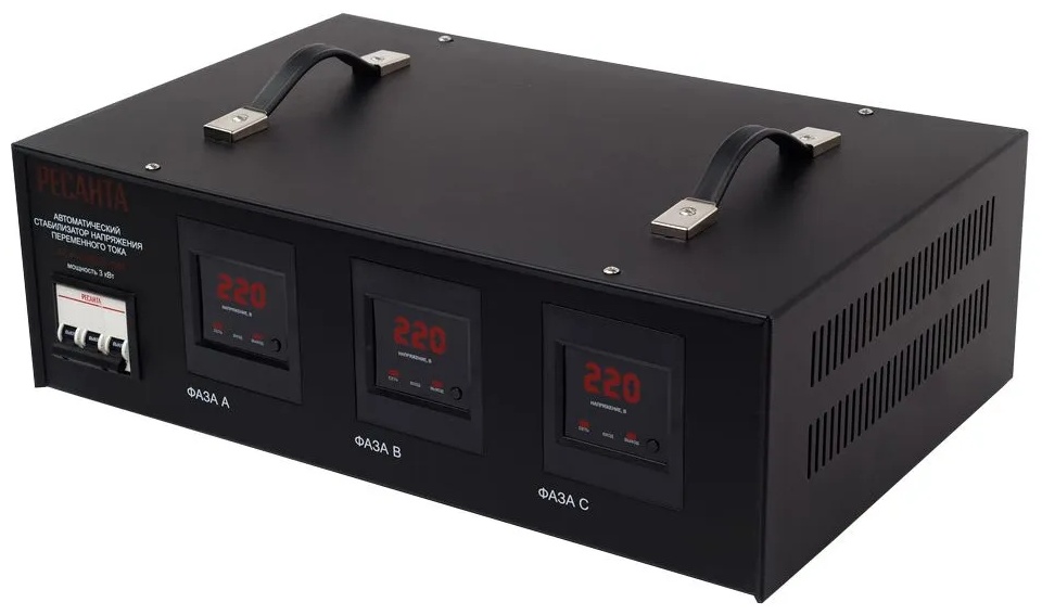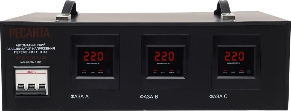Трёхфазный малогабаритный стабилизатор Ресанта АСН-3000/3-ЭМ служит для защиты электрооборудования, общая мощность которого составляет 3кВт от скачков напряжения питающей электросети. Он оснащён системой фильтров сетевых помех, управления и тремя информативными LЕD дисплеями. Реализована в модели Ресанта АСН-3000/3-ЭМ также термозащита, отключающая прибор при превышении суммарной мощности подключённого электрооборудования выше допустимой, т.е. 3 кВт.